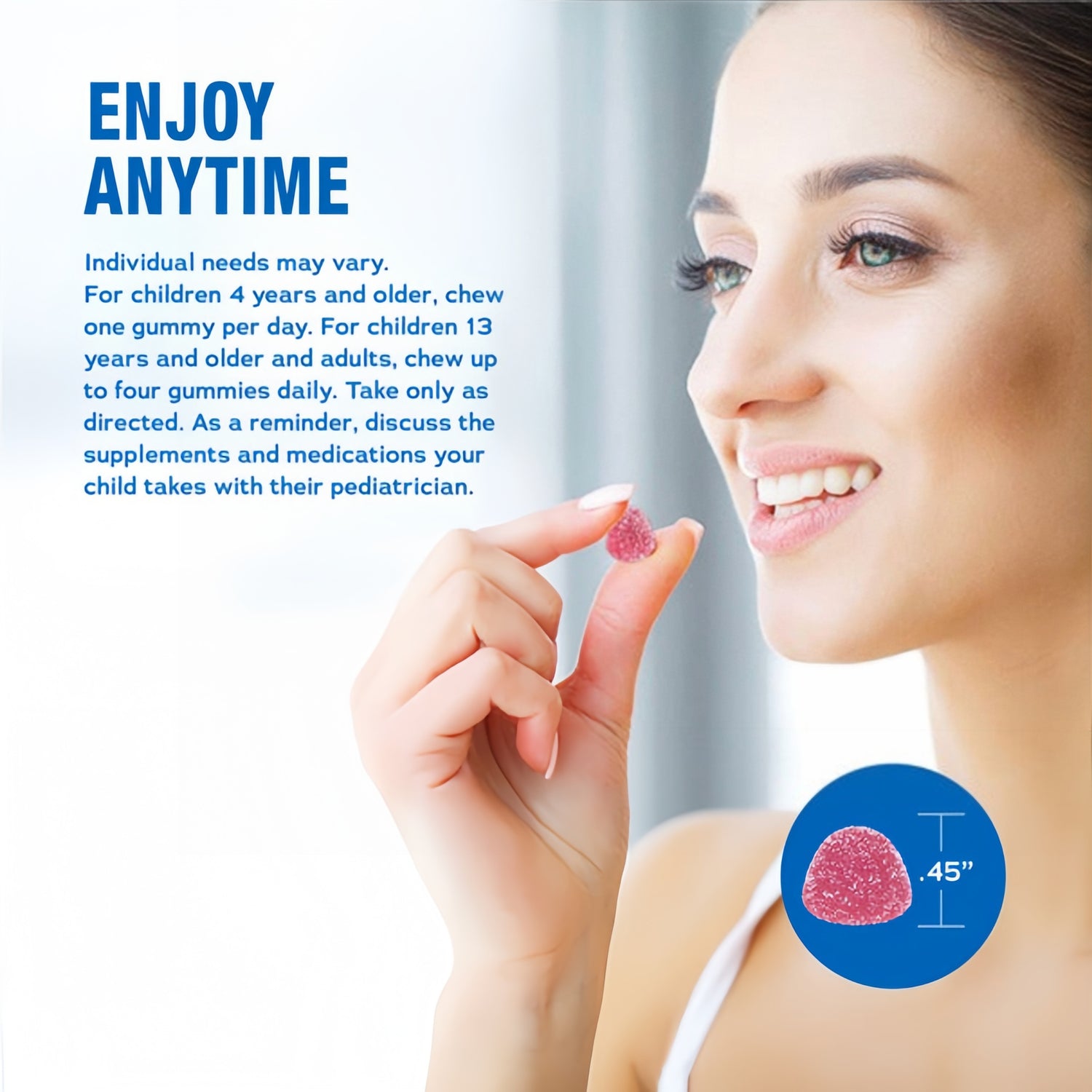 Individual needs may vary.For children 4 years and older, chewone gummy per day. For children 13years and older and adults, chew upto four gummies daily. Take only asdirected, As a reminder, discuss thesupplements and medications yourchild takes with their pediatrician.